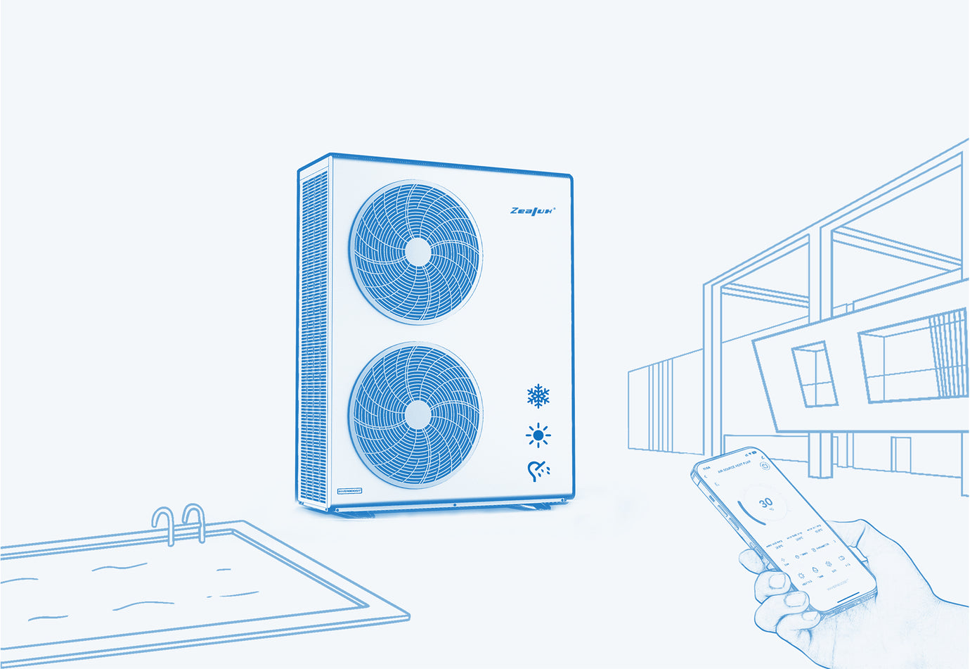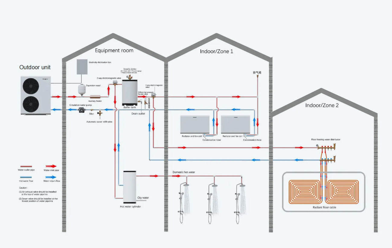 Zealux INVERBOOST air source heat pump can make your home more comfortable. The all-in-one design integrates air heating, cooling, floor heating and domestic hot water into one system, which fully meets end user needs. Eco-friendly with high energy efficiency, it contributes to your low carbon life. The low noise design creates more relaxing enviroment. The intelligent control system bring convenience to users and service providers.