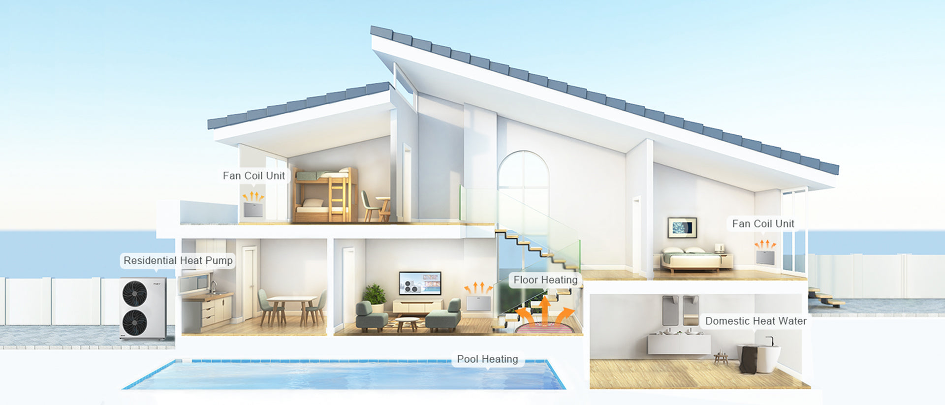 Perfect energy saving solution, space heating and cooling and domestic hot water are provided. It can replace or work with traditional gases or oil-fired boilers.